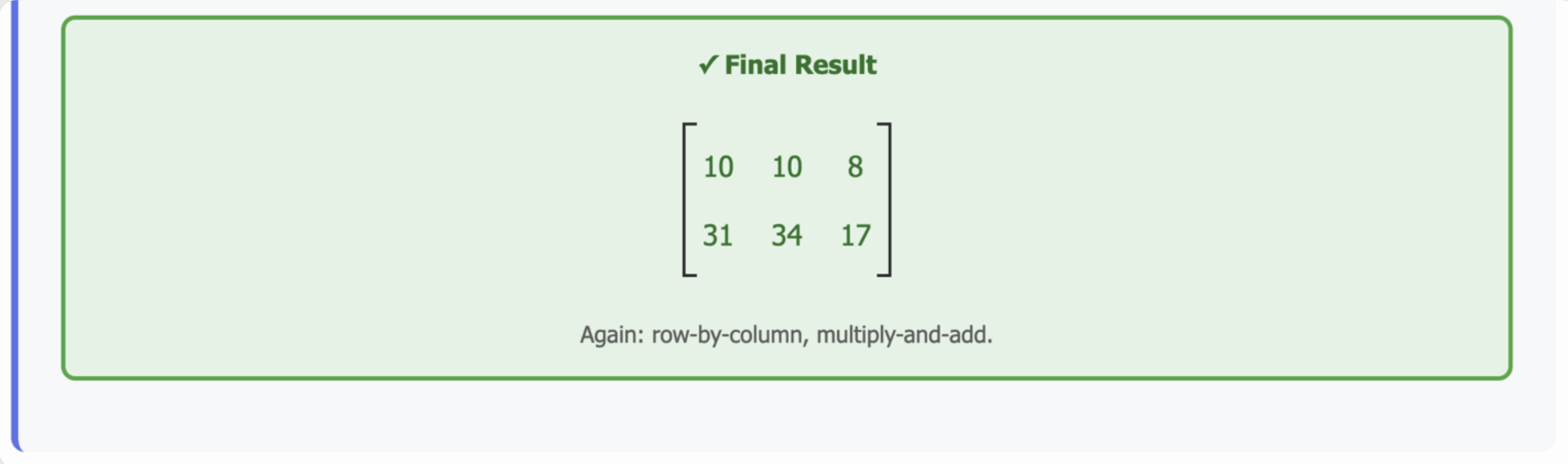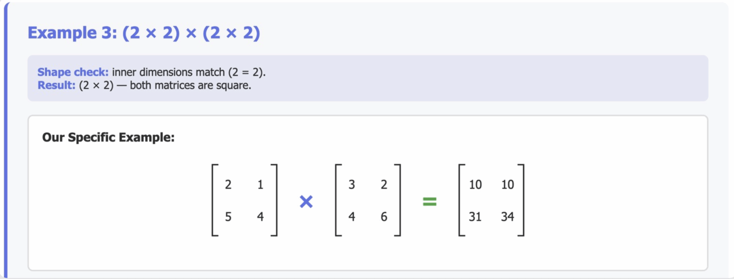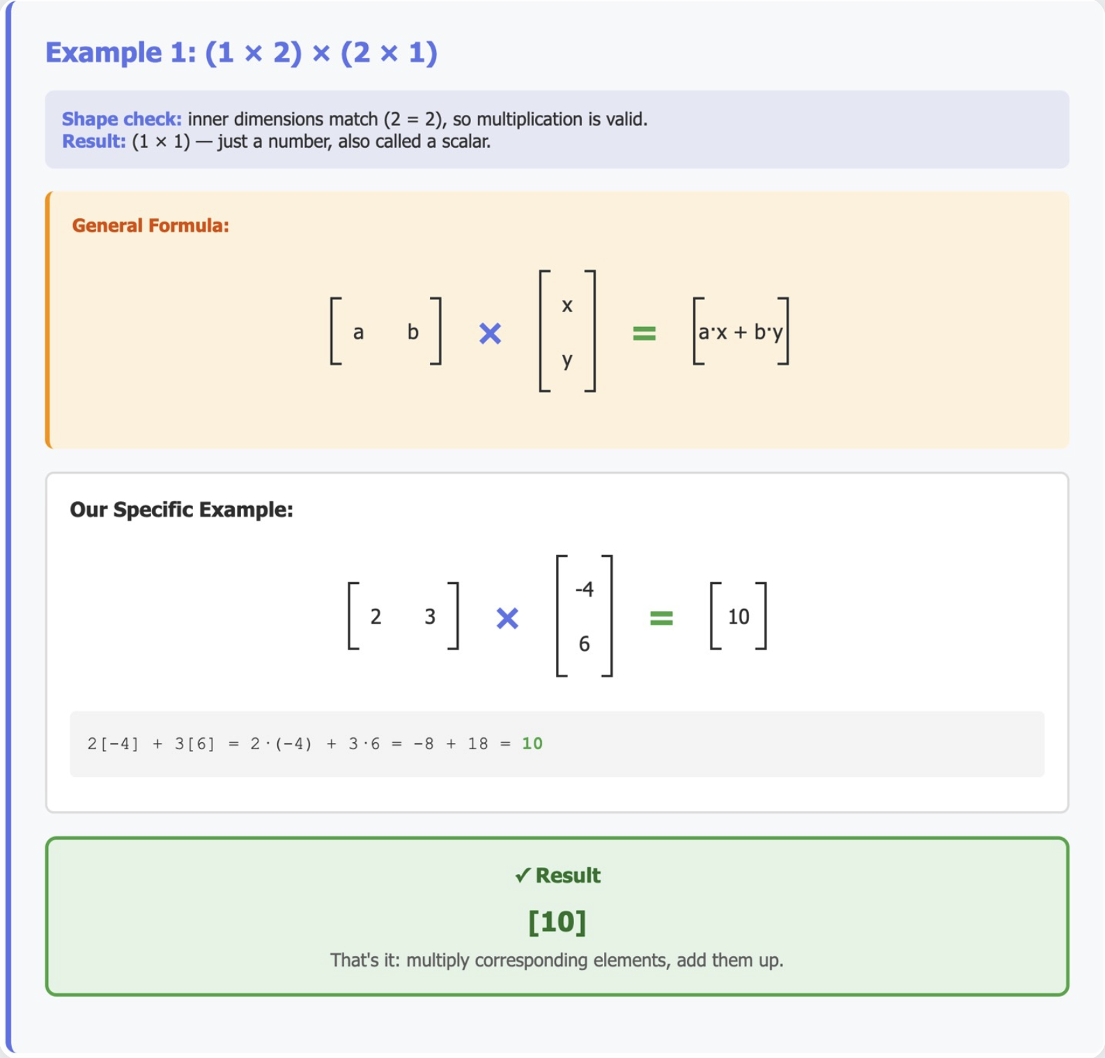 Work through them until you can “see” the shapes and even predict the result’s dimensions before doing any math. That intuition is what you’ll rely on when building AI models.