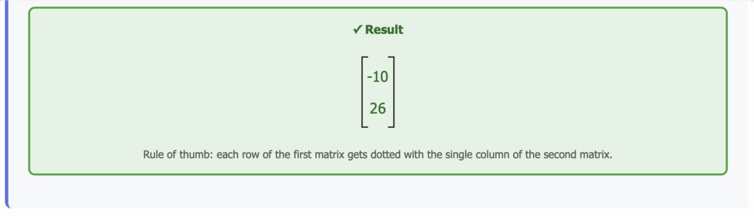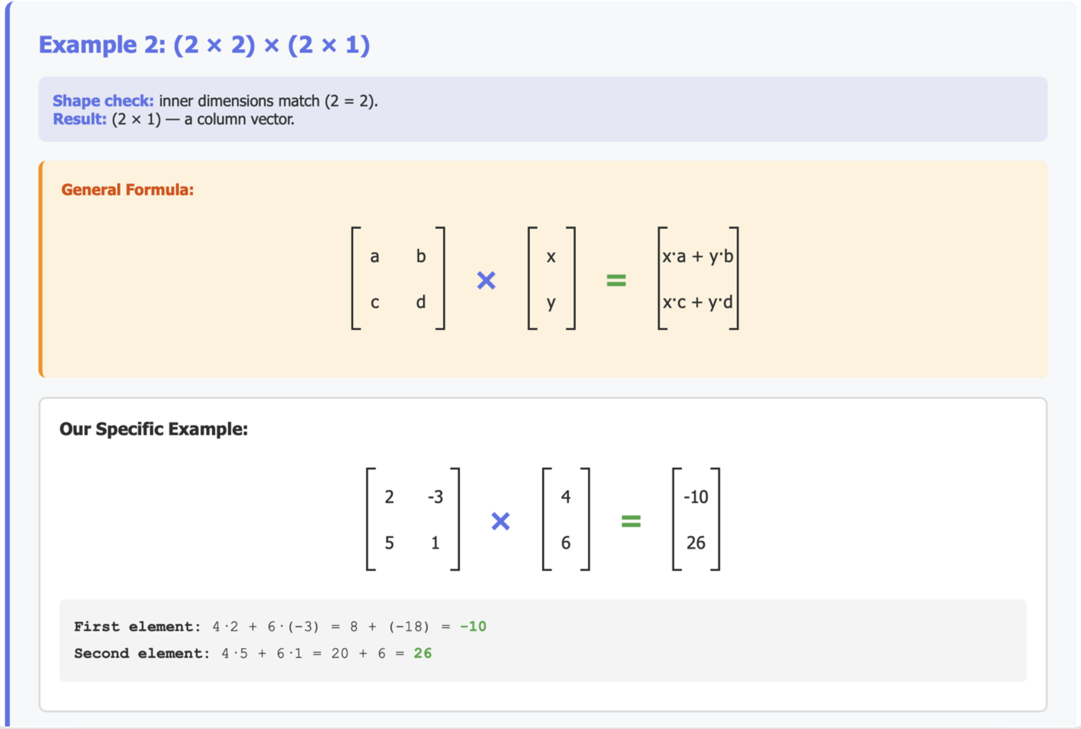 Result: outer dimensions show the result shape is (2 × 1)—a column vector.