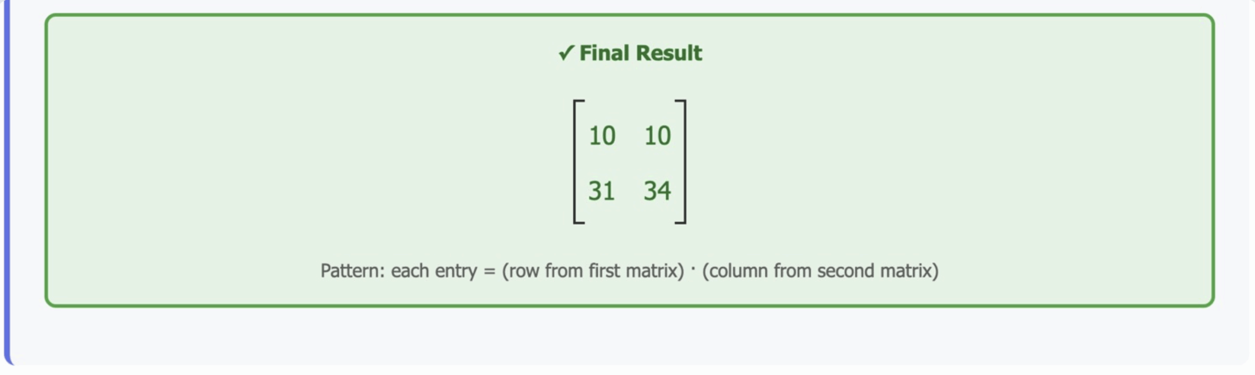 Matrix multiplication is not optional background knowledge—it’s the core operation of AI. Get comfortable with shapes, rules, and calculations, and you’ll be ready for everything from recommendation systems to large language models.