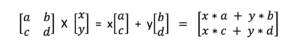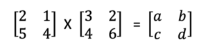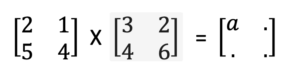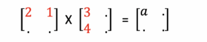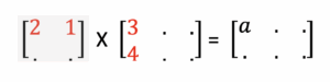 ‘a’ is in the first row of the result. And it is in the first column of the result. To get it we multiply and add the first row of the first matrix by the first column of the second matrix: